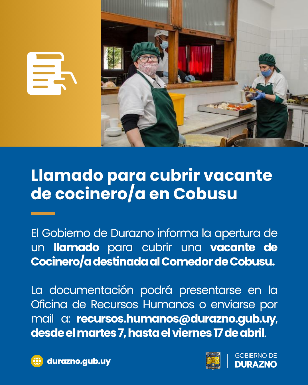 El Gobierno de Durazno, a través del Departamento de Promoción Social, informa la apertura de un llamado para cubrir una vacante de Cocinero/a destinada al Comedor de Cobusu.