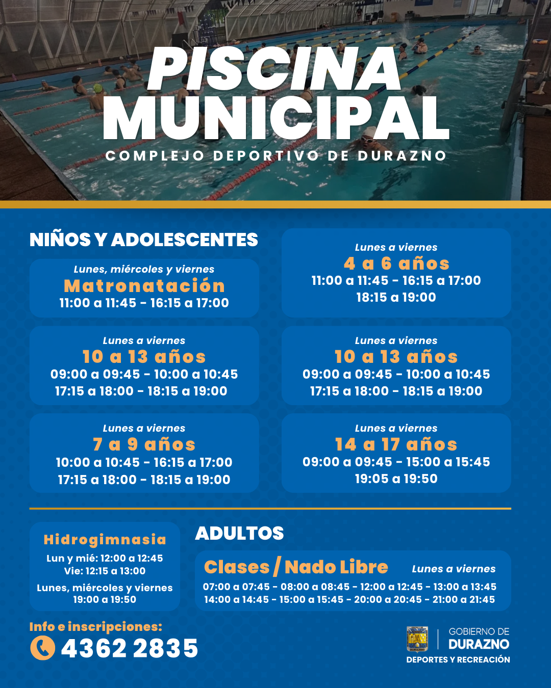 La Piscina Municipal, ubicada en el Complejo Deportivo de Durazno, contínua sus propuestas como un espacio pensado para el disfrute, la actividad física y el aprendizaje, con una oferta organizada y accesible para vecinos de todas las edades. El programa combina recreación y formación, priorizando la seguridad, el orden y el buen uso de las instalaciones.